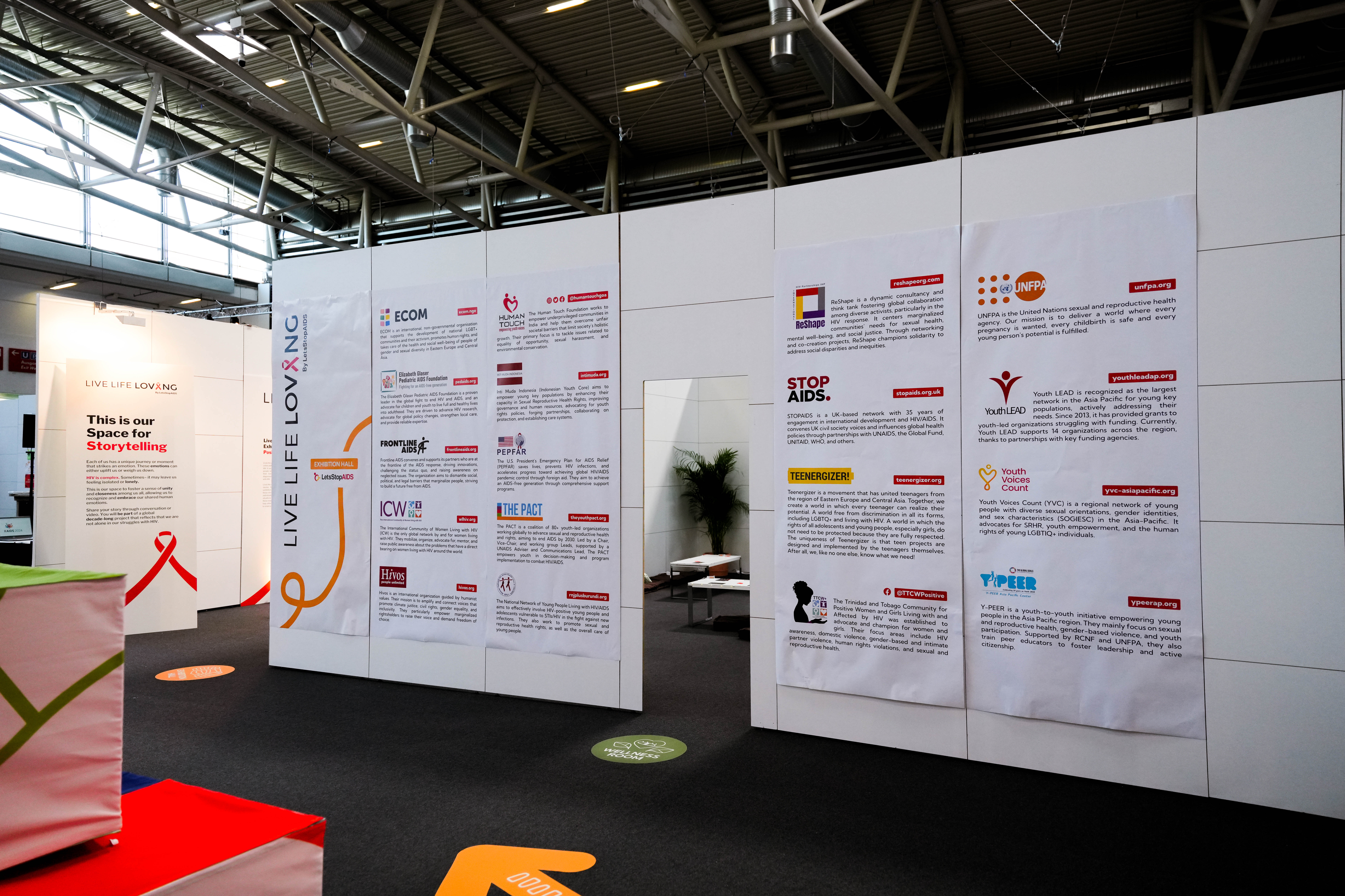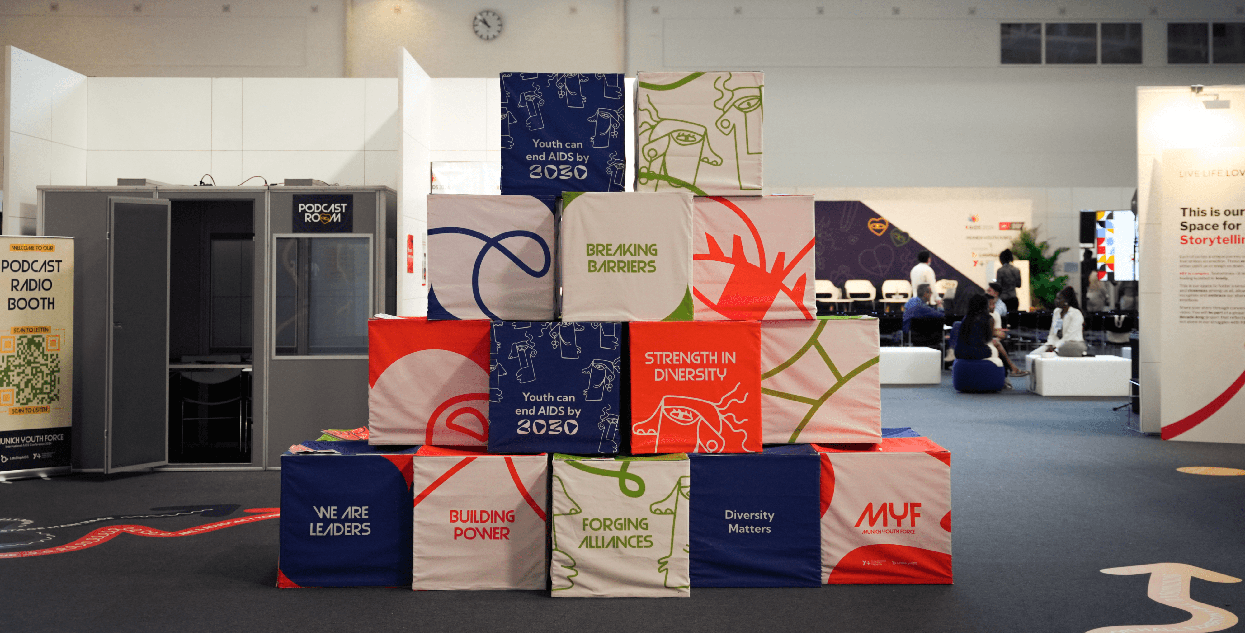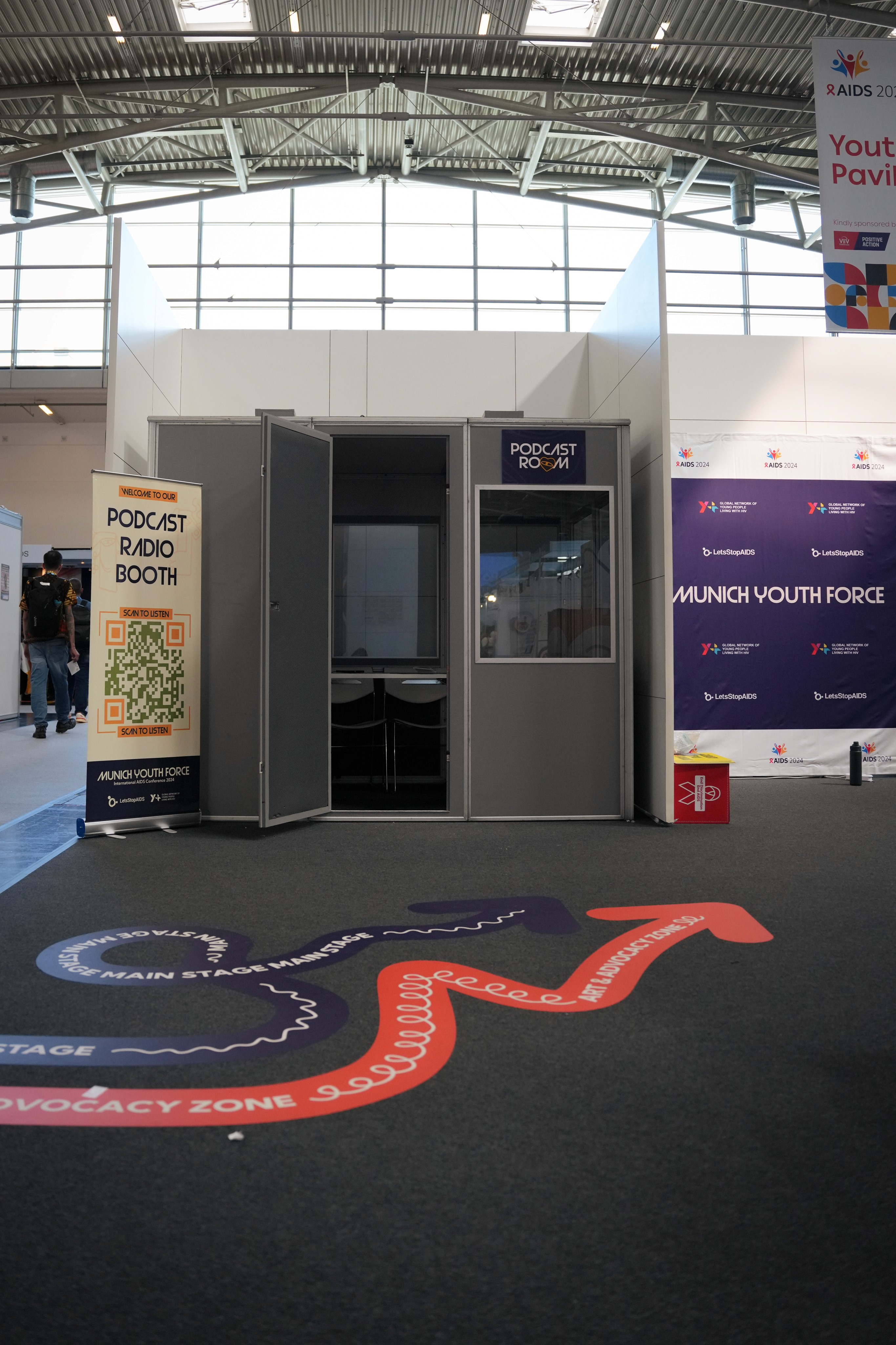 Exhibition areas for Y+ Global and LetsStopAIDS were designed with their unique goals in mind: Y+ Global hosted a podcast booth focused on youth dialogue, while LetsStopAIDS curated a museum-style exhibition and a video booth for youth voices to be recorded and shared.