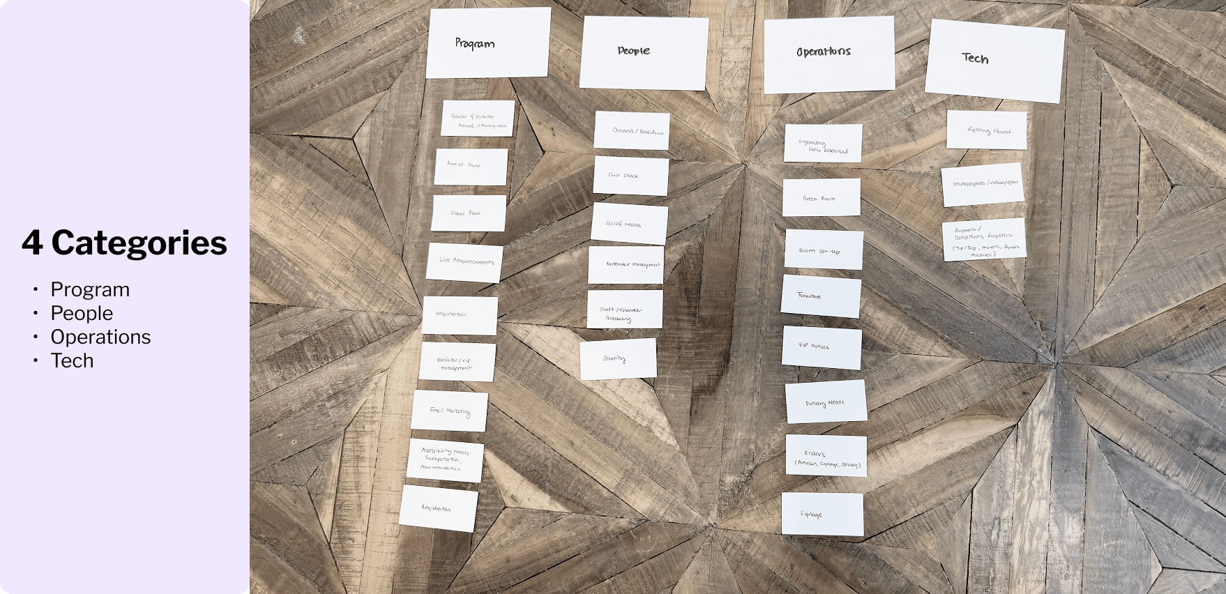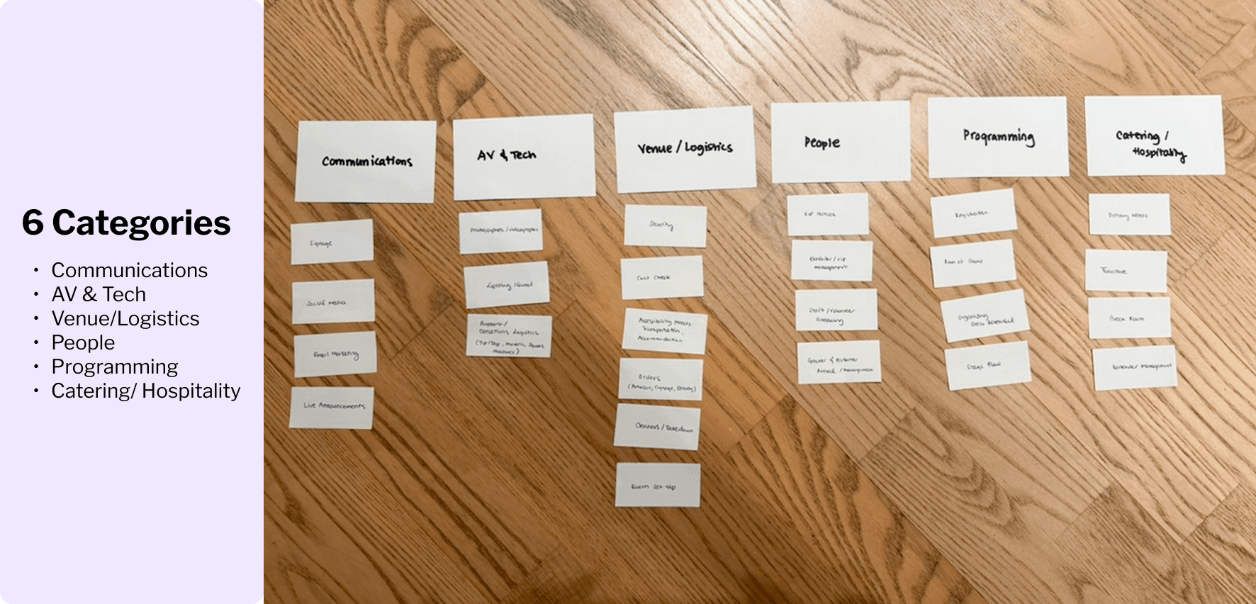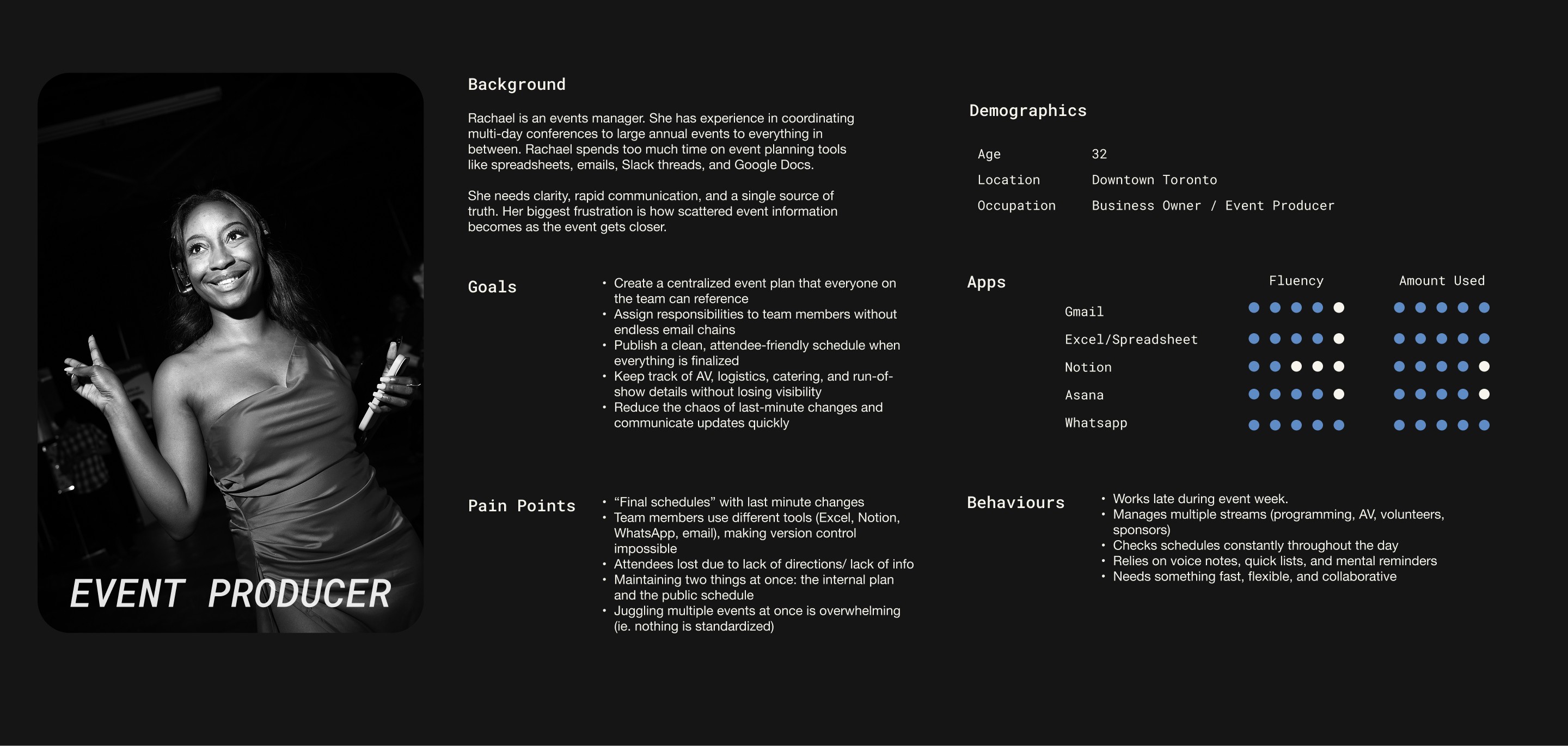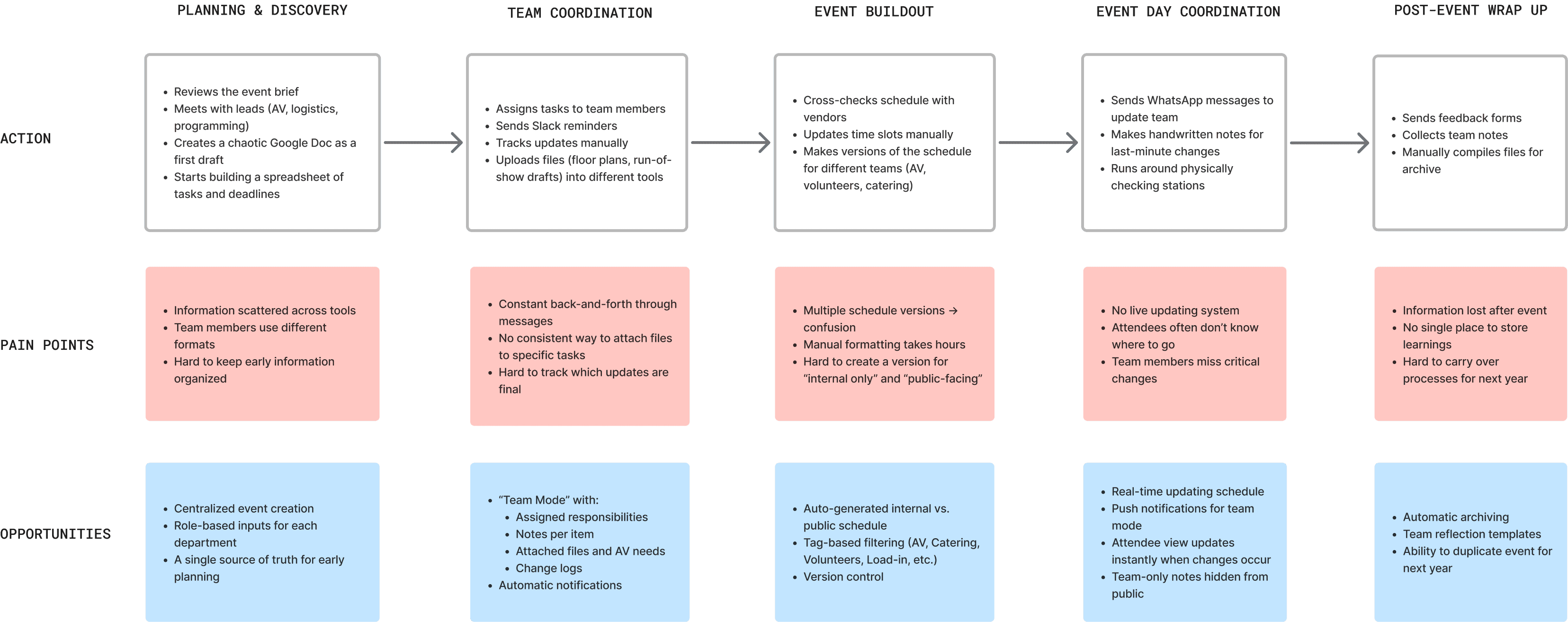 I first conducted qualitative interviews with event planners, organizers, and project managers to understand their workflows, frustrations, and mental models around building out schedules for the day of.