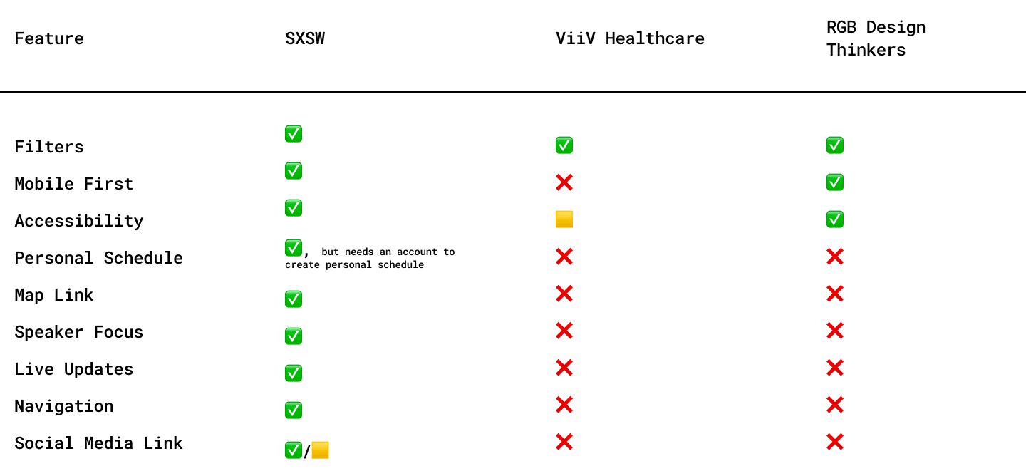 To identify the key features needed to build out a scalable system, I completed a competitor analysis of SXSW, ViiV Healthcare, and RGB Design Thinkers Conference, followed by a feature prioritization matrix.