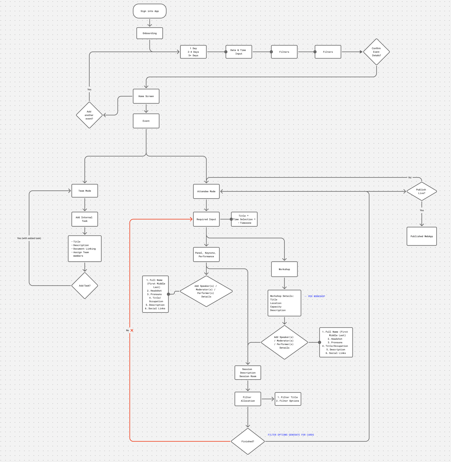 Throughout this phase, I continuously evaluated how each idea supported the dual-system model, ensuring the platform stayed scalable for organizers while remaining intuitive and streamlined for attendees. This ideation work formed the foundation for a more refined, user-informed design direction.