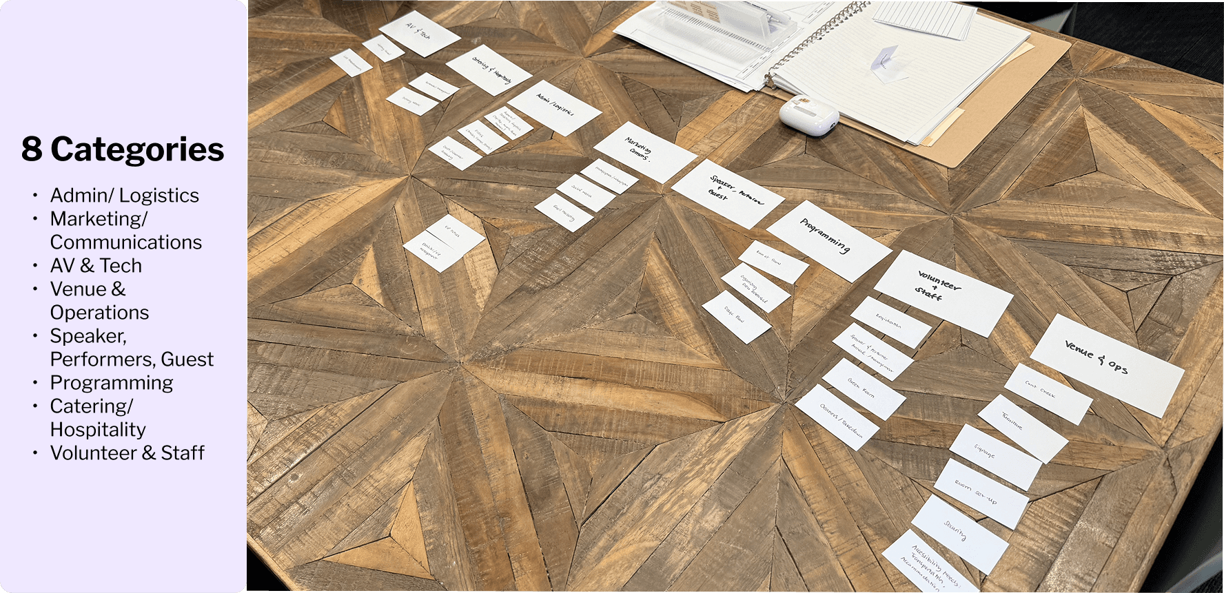 To reduce friction when organizing event-related tasks, I worked closely with an Events Manager to identify the types of tasks typically created during event planning. Together, we defined an initial set of high-level task categories based on real operational workflows.
