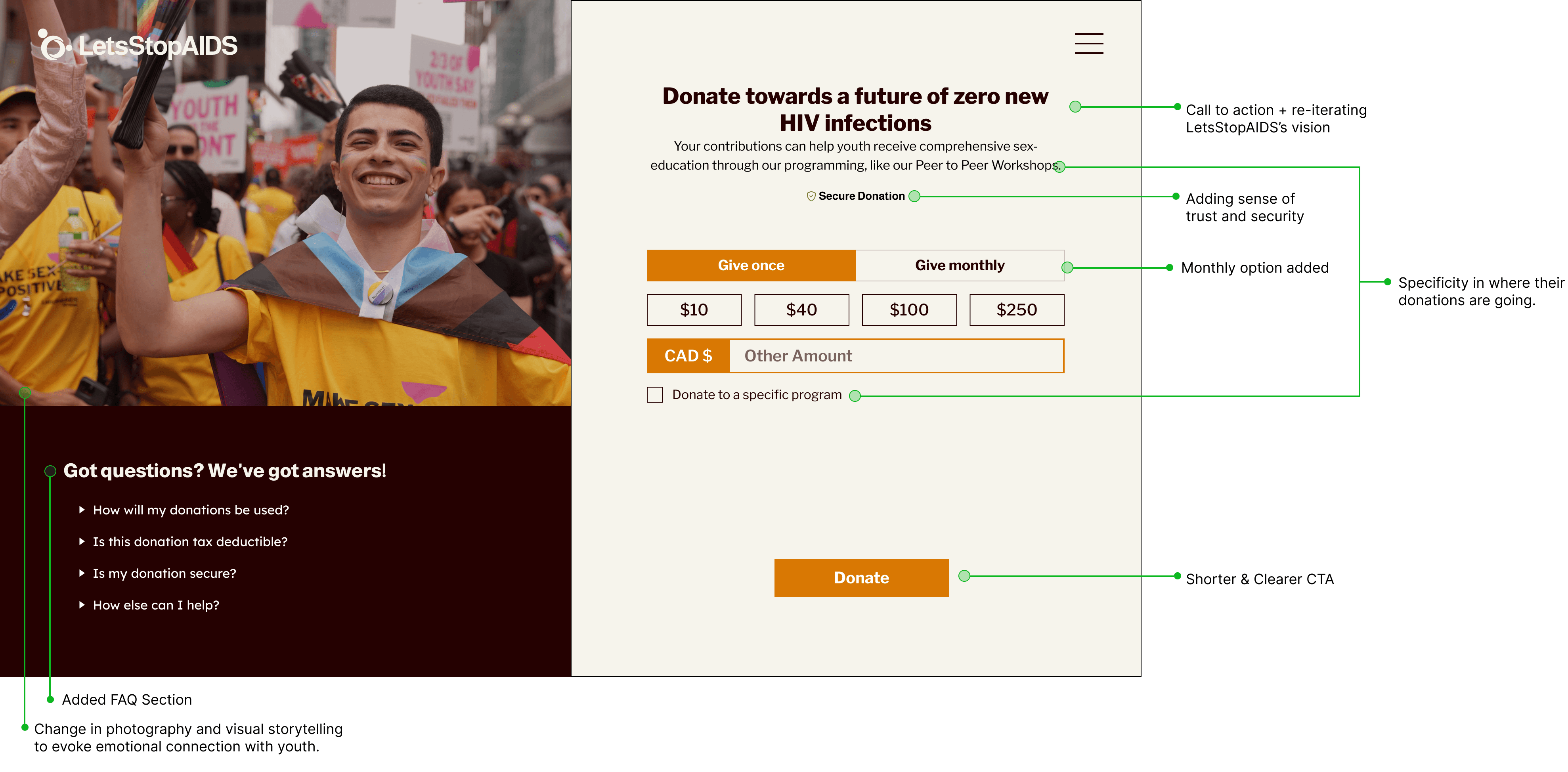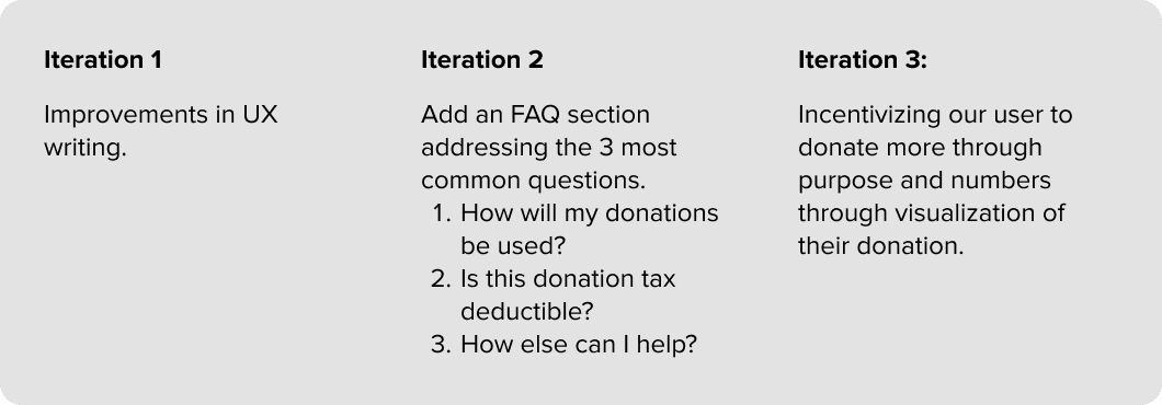 The donation page iterations demonstrated how interaction design and content hierarchy directly impact user decision-making. Carefully guiding users through each step of the journey became a key learning, showing how intentional UX design can transform complex actions into simple, confident moments.