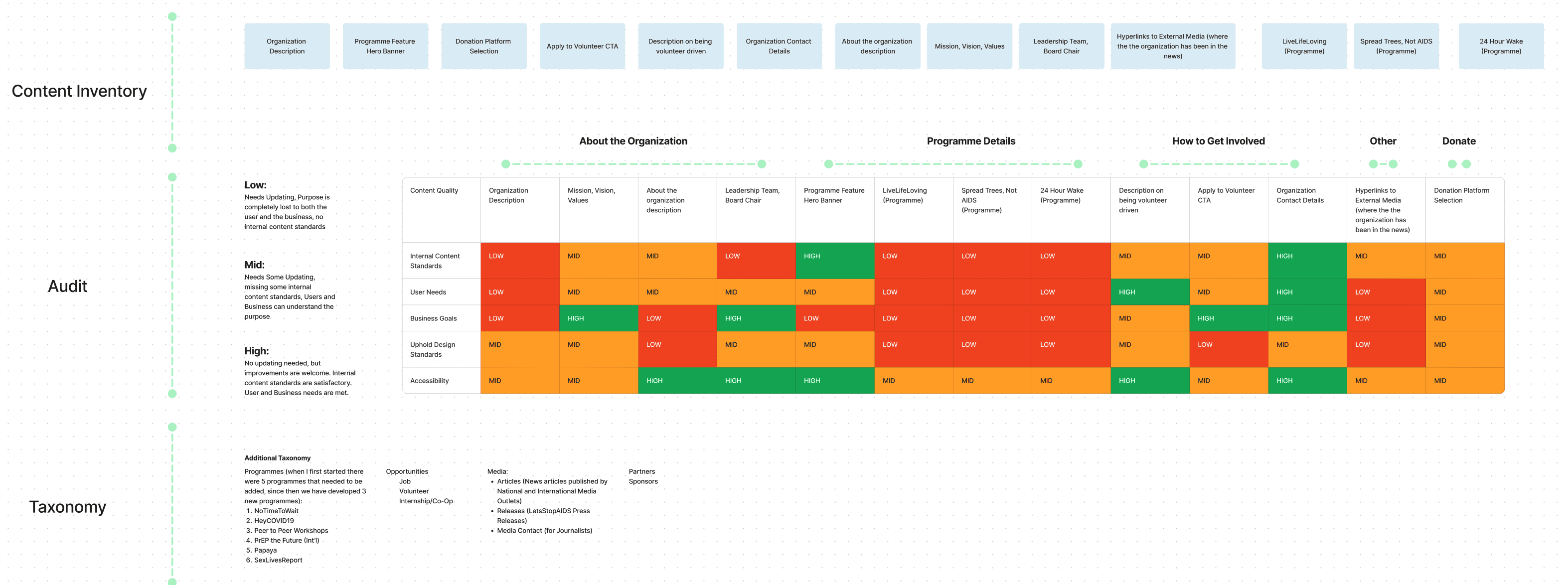 A content audit was conducted to measure the quality of the content used at the time. The auditing was measured by how much updating was needed, whether users found the content confusing, if the content was still in line with the business's new strategic goals, as well as the state of the internal content standards.