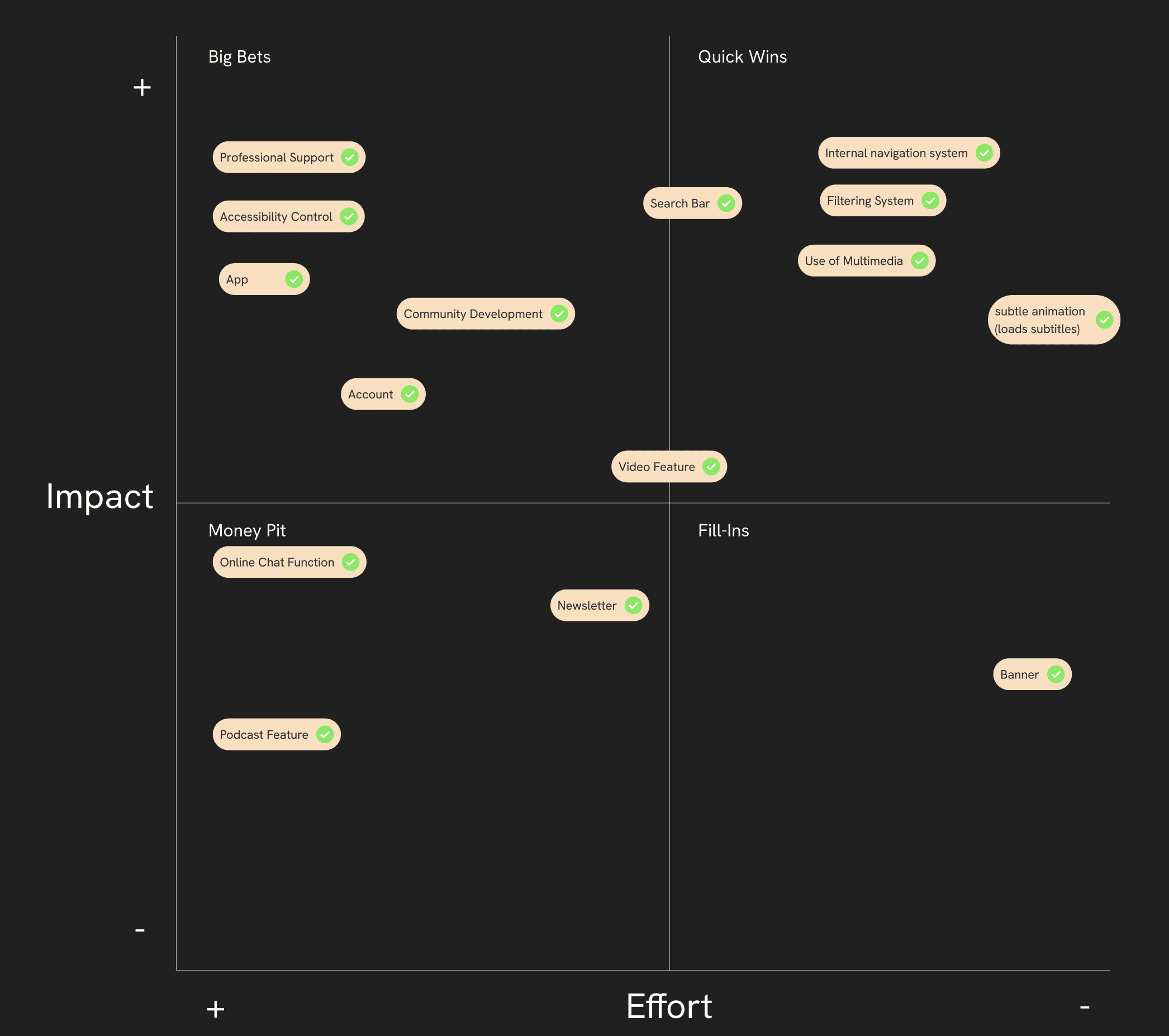 We then created a Impact-Effort Matrix to gather what building blocks were required to launch Papaya.